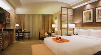 For a truly unique Vegas experience, this 550-square foot suite boasts gorgeous views from the private balcony. Each suite includes a dedicated sitting area, kitchenette, spacious bedroom with king-sized bed, 42-inch HD TV and a whirlpool spa tub.