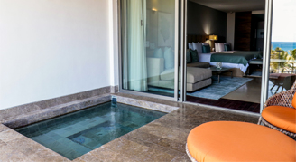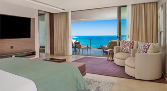 Suites feature a partial-ocean view or an ocean view. Additional amenities include a plunge pool on the terrace and a separate living and dining area.