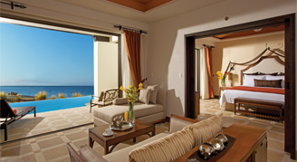 Suites feature an ocean view. Additional amenities include a separate living area and direct pool access.