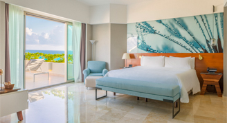 Suites feature an ocean view. Additional amenities include a hydrotherapy Jacuzzi, a spacious terrace, 1.5 bathrooms, a separate living area, champagne and chocolate-covered strawberries upon arrival, a romantic dinner, a special dinner at MB restaurant, a 50-minute couples massage and a Bali bed at the pool or the beach.