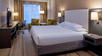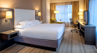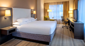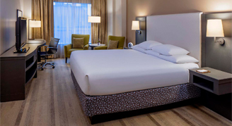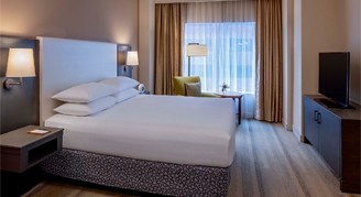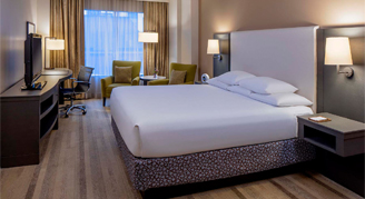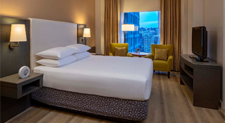 Rooms are located on higher floors and feature one king bed, workstation, and bathroom with a glass-enclosed walk-in shower. Additional amenities include a 55-inch flat-screen TV, Rainforest Green and Boona single-serve coffee and tea maker, mini refrigerator, and BeeKind hypoallergenic bath amenities.