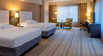 Rooms feature two queen beds, sitting area, workstation, and bathroom with a shower/tub combo. Additional amenities include a 55-inch flat-screen TV, Rainforest Green and Boona single-serve coffee and tea maker, mini refrigerator, and BeeKind hypoallergenic bath amenities.