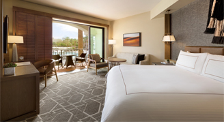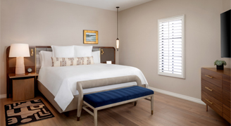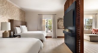 These rooms are located in the Sunset Beach Wing on the West side of the property. Featuring elevated architectural elements including stackable sliding glass doors fitted with plantation shutters, the line between indoors and outdoors blends beautifully allowing guests to comfortably enjoy breathtaking views of the resort grounds. Wrapped from end-to-end in useful luxury, enjoy a collection of contemporary amenities such as spacious double vanities, an oversized modern spa shower, and locally crafted Thunderbird woven art pieces above the bed. Additional amenities include a 50" HDTV, sofa and an extended closet.
