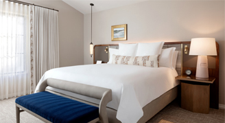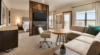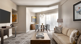 Functional layouts elevate the Fairmont Gold Junior Suites, each equipped with a wall divider separating the living and bedroom into two defined spaces with 60" HDTVs on each side. Luxuries abound, with upgraded patio furniture on private balconies, travertine and granite-appointed bathrooms, an in-room mini-fridge, upgraded linens, a Nespresso coffee maker, upgraded plush robes and more. Suites are located in an enclave on the Southeast corner of the resort and include complimentary spa access and exclusive lounge access, providing breakfast and afternoon appetizers daily, private concierge service and complimentary soft drinks.