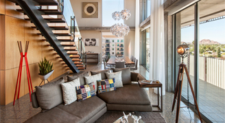 Treat yourself to a modern desert loft with mid-century touches. Enjoy a fully appointed kitchen, two-story living room and dining room area, a master bedroom, private balconies, and stunning views of Camelback Mountain.