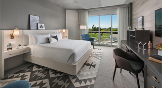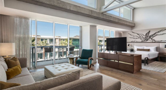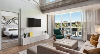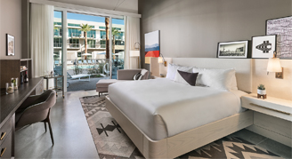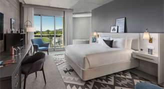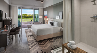 Rooms offer modern, custom furnishings and lighting – setting the tone for a well-styled retreat. Amenities include a classic cocktail cart, built-in workspace, and a spacious shower. Premium Rooms feature the added luxury of a 95-square-foot patio. The unique layout features an open bathroom with a curtain separating the bedroom and shower, and a separate washroom with toilet.