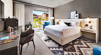 Rooms feature a 130-square-foot oversized patio on ground level with a chaise lounge and bistro seating area, floor-to-ceiling glass, custom furnishings and lighting, classic cocktail cart and a built-in workspace. The private, oversized terrace is complete with lush desert landscaping and modern seating areas for enjoying Paradise Valley's beautiful weather. The unique layout features an open bathroom with a curtain separating the bedroom and shower, and a separate washroom with toilet.
