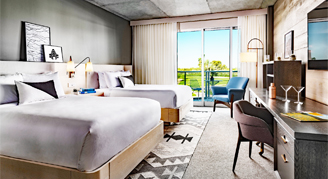 Rooms offer views of The Citizens Club Pool from a private 160-square-foot cabana patio, an open layout, floor-to-ceiling glass, in-room cocktail cart and coffee, and a built-in workspace. The classic design and neutral palette set the tone for a revitalizing stay.