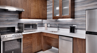 Studio Suites offer a full kitchen with a two-burner stove, full-size refrigerator, microwave, cookware and plateware, a two-stool dining bar, and a living area with a full-size sofa bed and desk. Additional features include a full bathroom with residential-sized amenities and a spacious walk-in shower.