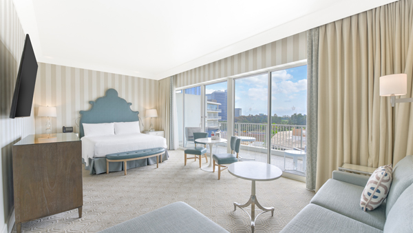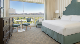 Rooms feature one king bed, a sitting area and views of the hotel grounds and Century City. Additional amenities include two complimentary bottles of water, bathrobes and a 65-inch HDTV.