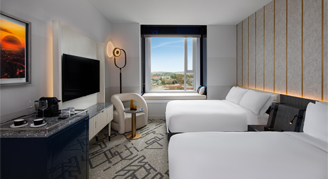 Rooms feature two queen beds, a window seat, and a marble bathroom with a courtyard or partial-city view.