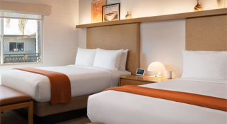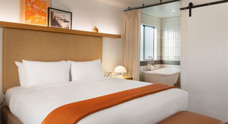 Rooms feature mid-century style and are located on the second floor with views of the courtyard. Additional amenities include a Google Nest Hub concierge system, Smeg kettle and an essential oil diffuser.
