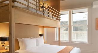 Rooms feature mid-century style and one queen bed with a bunk bed on top. Additional amenities include a Google Nest Hub concierge system, Smeg Kettle and an essential oil diffuser.