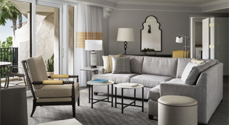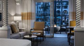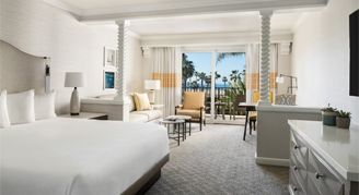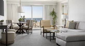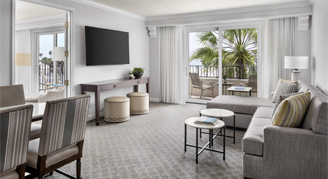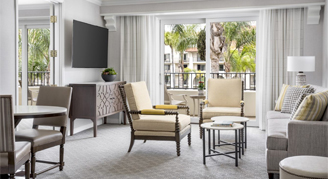 The Huntington Suite features one king bed, a living room with a sofa bed,and overlooks the ocean, pool, or palm grotto.