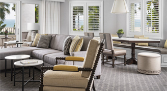 The Pacific Suite features a master bedroom with one king bed, a living room with a sofa bed, and a large dining area and table that seats up to eight people for entertaining. Enjoy pool or ocean views from the suite’s private patio.