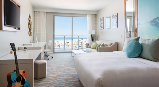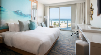 Spacious and serene, the Ocean-View Studio offers stunning views of the Pacific Ocean and Huntington Beach pier from the private balcony. Bathed in sea and sand tones, these lovely studios offer a luxurious king bed with custom Frette® linens, intoxicating luxury Aarna Spa bath products, a Drinkworks Home Bar by Keurig, and exclusive hooded sweatshirt robes and flip-flops. A cozy sofa bed adds a bit of extra space for an even more comfortable stay.