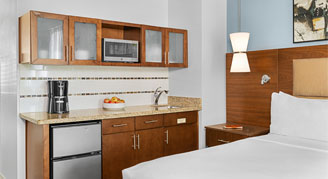 Rooms feature one king bed, a desk and chair, sitting area with a pull-out sofa, kitchenette, and balcony with a bistro table and two chairs.