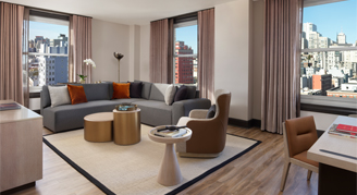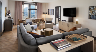Suites feature a private bedroom, separate living space with dining table and six chairs, a sofa, armchair, work desk, chair and bathroom with a rainfall shower, oversized back-lit wall mirror and robes and slippers. Additional amenities include a Keurig coffee maker and flat-screen TV with Staycast Sonifi streaming and Google Chromecast.
