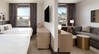 Rooms feature a city view, work desk, chair and bathroom with a rainfall shower and oversized back-lit wall mirror. Additional amenities include a Keurig coffee maker and flat-screen TV with Staycast Sonifi streaming and Google Chromecast.