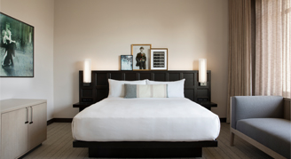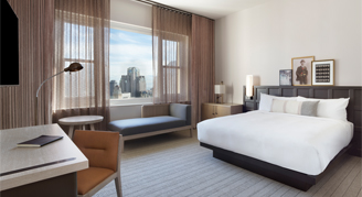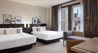 Sleek, modern and reflecting the hotel's historic spirit of design, the recently-renovated Deluxe Rooms feature one king or two queen beds, and a work desk and chair. The bathroom offers a walk-in rainfall shower, oversized back-lit wall mirror and a hair dryer. Other amenities include a mini-bar, mini-fridge, Keurig coffee maker, laptop-size safe, iron/ironing board, flat-screen television with Staycast Sonifi streaming, and Google Chromecast, along with premium movie channels and complimentary Wi-Fi.
