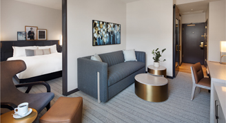 Rooms feature a pull-out sofa bed, work desk, chair and bathroom with a rainfall shower and oversized back-lit wall mirror. Additional amenities include a Keurig coffee maker and flat-screen TV with Staycast Sonifi streaming and Google Chromecast.