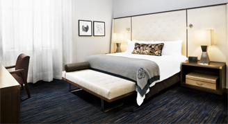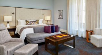 With their signature solid oak door and monogrammed brass doorknob, guest rooms welcome you with rich hues and beautifully layered textiles paying tribute to California Impressionism. Rooms feature restful beds with Frette linens, 11-foot ceilings and large windows offering full or partial views of downtown. Additional features include a 48” TV, ample power access and a bright, marble bath.