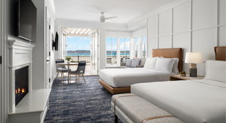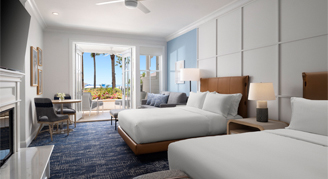 Ocean-View Rooms include two queen beds, a cozy fireplace, marble bathroom and a beautiful view of the Pacific Ocean from your patio or balcony.