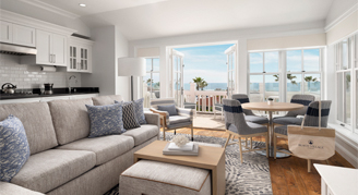 These spacious contemporary rooms feature refined coastal design, luxurious bathrooms with walk-in showers, and private balconies or covered terraces with lounge seating and fire features on ground floor units. Suites also feature gourmet kitchens and living rooms.