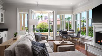 Coastal-View Villas include one king bed, two cozy fireplaces, a marble bathroom, separate kitchen, a living great room with a sofa bed, and a partial-ocean view from your ground floor patio.