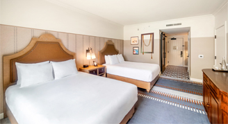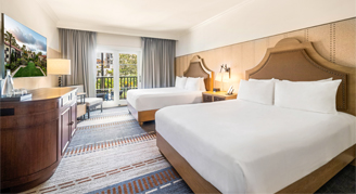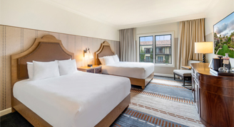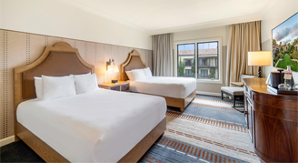Rooms feature views of the pool and two queen beds on 100% Turkish cotton linens, broad windows, HD 55" Smart TVs with local and premium channels, Netflix and Hulu. Fresh Amenity Collection includes shampoo, conditioner, lotion and two terry bathrobes.
