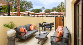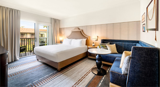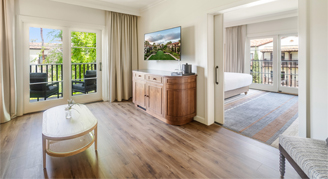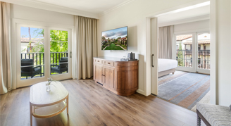 Suites feature a private patio or balcony with views of the garden courtyards or pool, one California king bed on 100% Turkish cotton linens, a living area, HD 55″ Smart TVs with local and select premium channels, Netflix and Hulu. Fresh Amenity Collection includes shampoo, conditioner, lotion, an extra-large soaking bathtub separate from the shower and two terry bathrobes.
