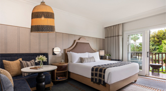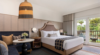 Rooms are located on floors 2 - 3 and feature sliding doors that open to a private balcony with views of the botanical gardens, one California king bed on 100% Turkish cotton linens, HD 55″ Smart TVs with local and select premium channels, Netflix and Hulu. Fresh Amenity Collection includes shampoo, conditioner, lotion and two terry bathrobes.