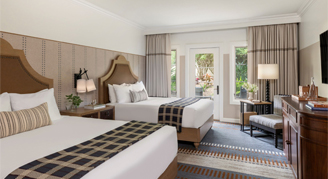 Rooms are located on floors 2 - 3 and feature sliding doors that open to a private balcony with views of the botanical gardens, two queen beds on 100% Turkish cotton linens,, HD 55″ Smart TVs with local and select premium channels, Netflix and Hulu. Fresh Amenity Collection includes shampoo, conditioner, lotion and two terry bathrobes.