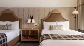 Rooms feature views of the garden and two queen beds on 100% Turkish cotton linens, broad windows, HD 55" Smart TVs with local and premium channels, Netflix and Hulu. Fresh Amenity Collection includes shampoo, conditioner, lotion and two terry bathrobes.