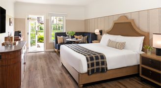 Rooms are located on the ground floor of the resort lodging with private patios and balconies, and feature one California king bed on 100% Turkish cotton linens, HD 55″ Smart TVs with local and select premium channels, Netflix and Hulu. Fresh Amenity Collection includes shampoo, conditioner, lotion and two terry bathrobes.