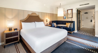 Rooms feature views of the pool from the private balcony and one California kind bed on 100% Turkish cotton linens, broad windows, HD 55" Smart TVs with local and premium channels, Netflix and Hulu. Fresh Amenity Collection includes shampoo, conditioner, lotion and two terry bathrobes.