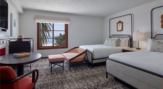 Rooms feature two queen beds, a 55” flat-screen HDTV, Keurig® coffee maker, and views of the Pacific Ocean.