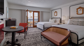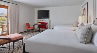 Rooms feature two queen beds, a 55” flat-screen HDTV, Keurig® coffee maker, and balcony with views of the Santa Ynez Mountains.