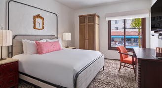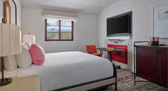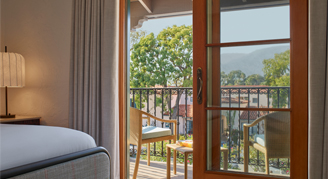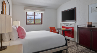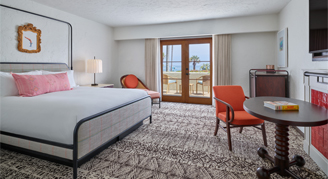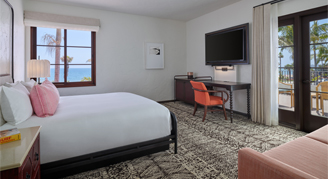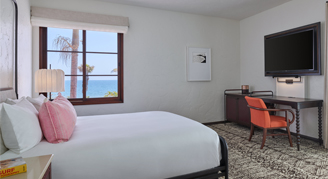 Rooms feature one king bed, a 55” flat-screen HDTV, Keurig® coffee maker, and balcony with views of the Santa Ynez Mountains.