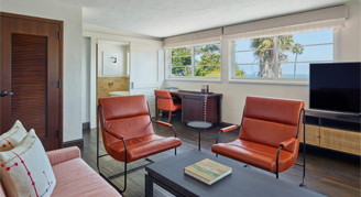 Suites feature one king bed, a separate living room, a 55” flat-screen HDTV, Keurig® coffee maker, and views of the Pacific Ocean.