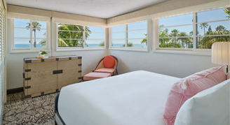 Rooms feature one king bed, a 55” flat-screen HDTV, Keurig® coffee maker, and views of the Pacific Ocean.
