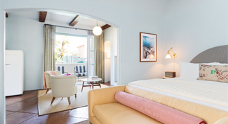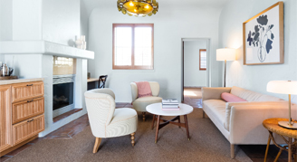 Rooms feature one king bed, a seating area, fireplace, and balcony or patio with resort views. Additional amenities include a Marshall Bluetooth speaker, Nespresso coffee maker and SMEG mini fridge with a fully stocked mini bar and snacks.