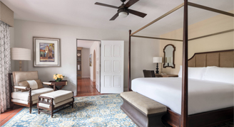 Rooms feature a king bed, chair, writing desk and a balcony or patio with views of the resort grounds.