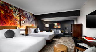 Located at the end of each hallway between floors 4 - 17, these suites are fully renovated with a brand new design blending contemporary decor with vintage 1960s flair, reminiscent of the hotel's and Montreal's glorious past. These elegantly furnished and spacious suites provide a peaceful environment, and consist of a bedroom with a full bathroom connecting to a living room area with a sofa bed and powder room, and can accommodate up to four people.