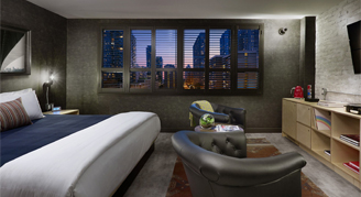 Kick back and recharge in style inside this industrially designed loft featuring cityscape views, comfy leather club chairs, rainforest shower, and a large work desk. A calm oasis in the middle of a bustling downtown.