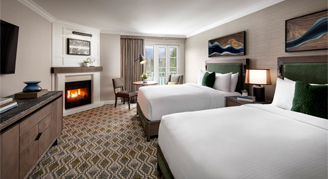 These unique suites located on the 10th and 11th floors are richly appointed, featuring a comfortable living room with a fireplace, double sofa bed, two side chairs and two flat screen televisions. The dual sleeping spaces include a king bedded area that is partially separated from the living area by partition, and a second bedroom with two queen beds. The Suite includes two bathrooms, including one deluxe marble bathroom with a jetted tub, oversized shower with Skinjay aromatherapy, and a double vanity. A triple set of French doors open up onto a viewing balcony with breathtaking views.