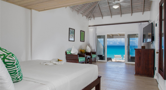 Guests are welcomed at the historical sugar mill reception and taken by golf cart to their room. Most accommodations are located directly on the white-sand beach; the remainder are tucked away in the gardens and boast their own private splash pool.
