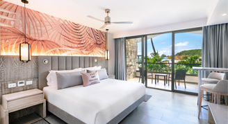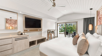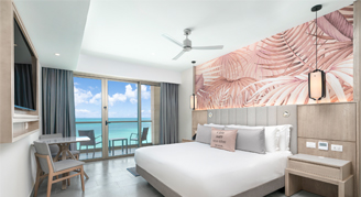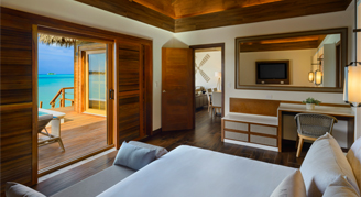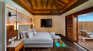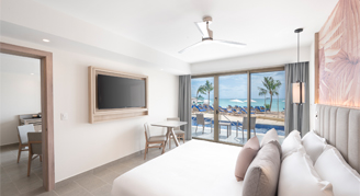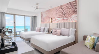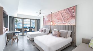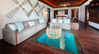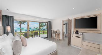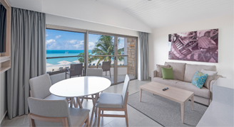 Suites feature a beachfront view and access to a swim-out pool with a separate living space and have a private balcony or terrace.