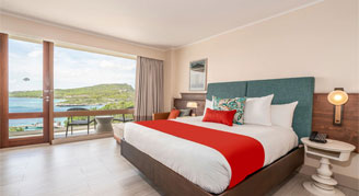 Rooms feature one king bed with furnished, private balconies and a 48” TV. All rooms include a walk-in shower and offer an island view.