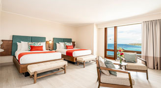 Rooms feature two double beds with furnished, private balconies and a 48” TV. All rooms include a bathtub and offer an island view.